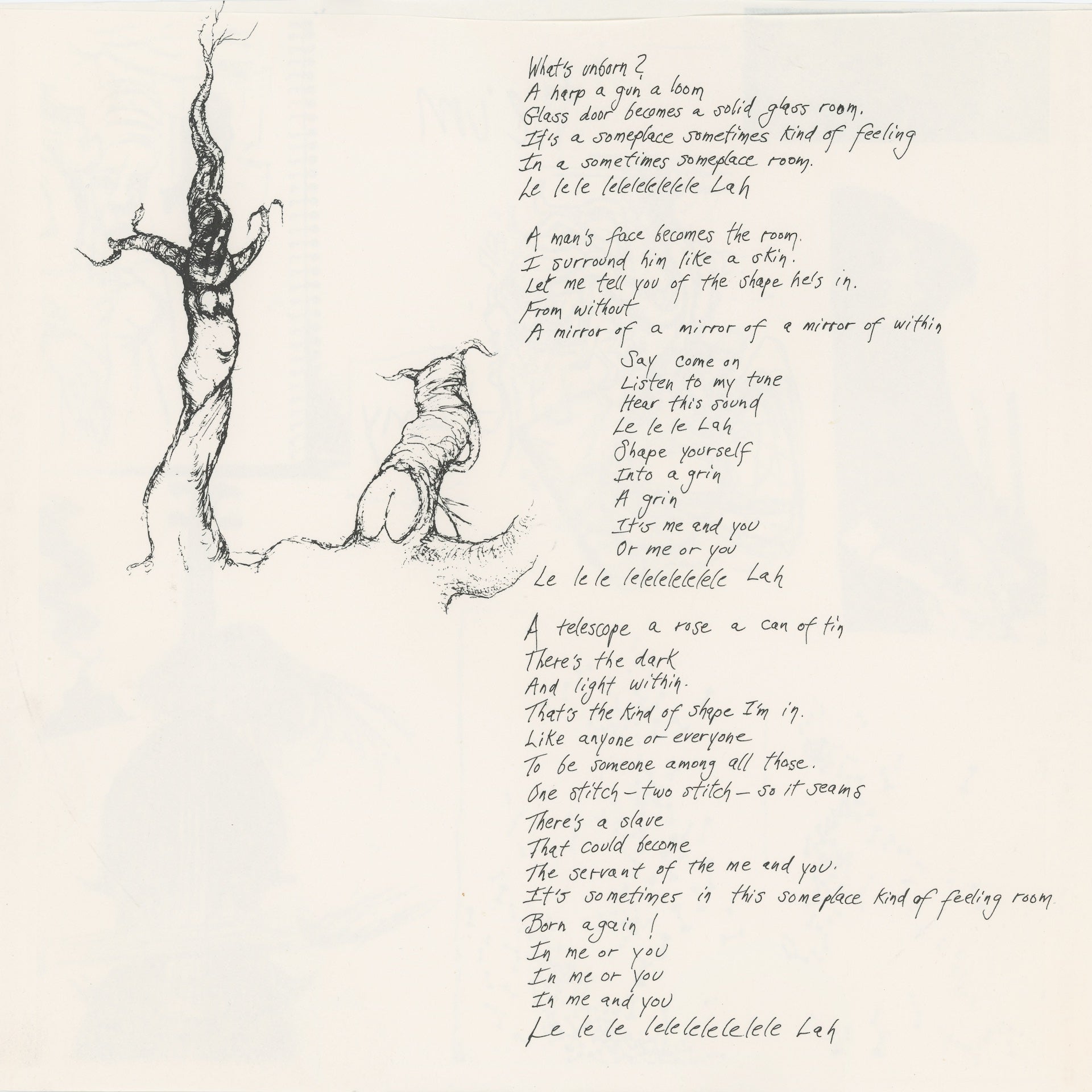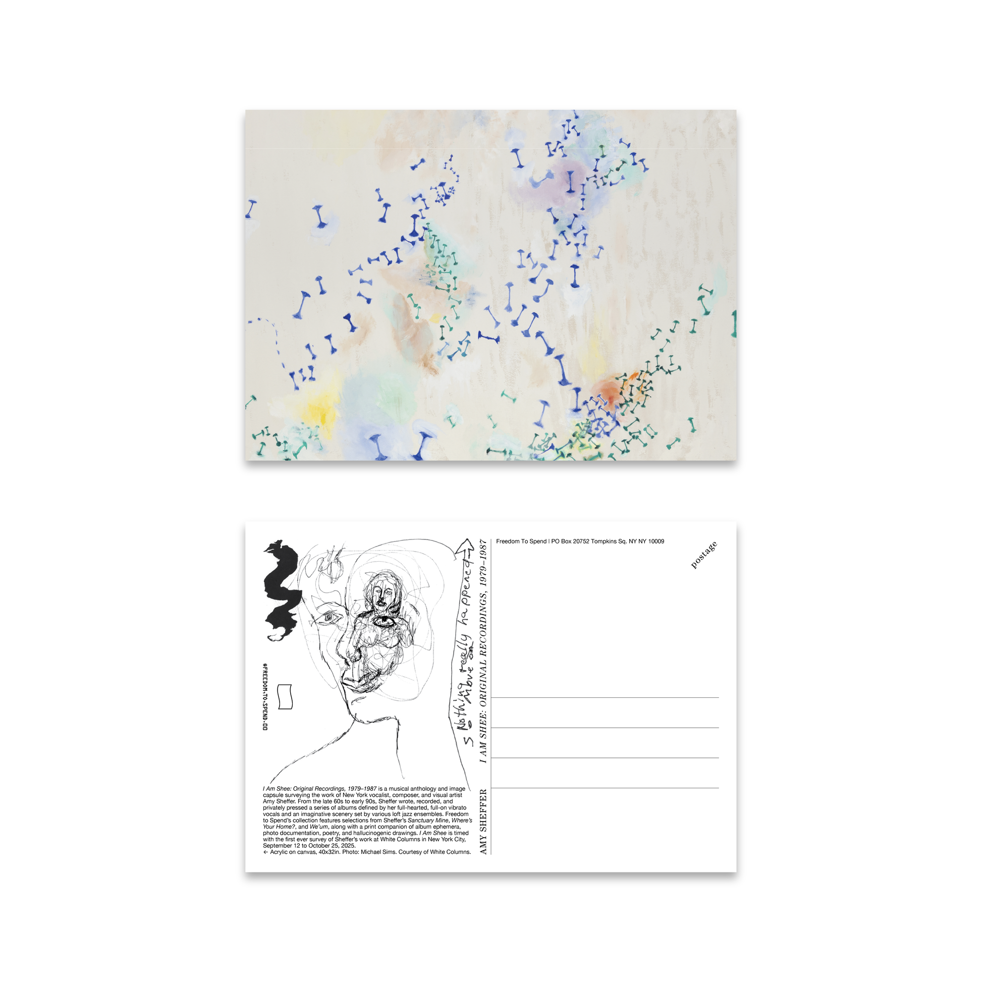 I Am Shee: Original Recordings, 1979-1987 is a musical anthology and image capsule surveying the work of New York vocalist, composer, and visual artist Amy Sheffer. From the late 60 to early 90s, Sheffer wrote, recorded, and privately pressed a series of albums defined by her full-hearted, full-on vibrato vocals and an imaginative scenery set by various loft jazz ensembles. Freedom to Spend’s collection features selections from Sheffer’s Sanctuary Mine, Where’s Your Home?, and We’um, along with a print companion of album ephemera, photo documentation, poetry, and hallucinogenic drawings. Sheffer’s output is evidence of a life fully charged and receptive to free-flowing energies — every object a portal, every sound an attunement.