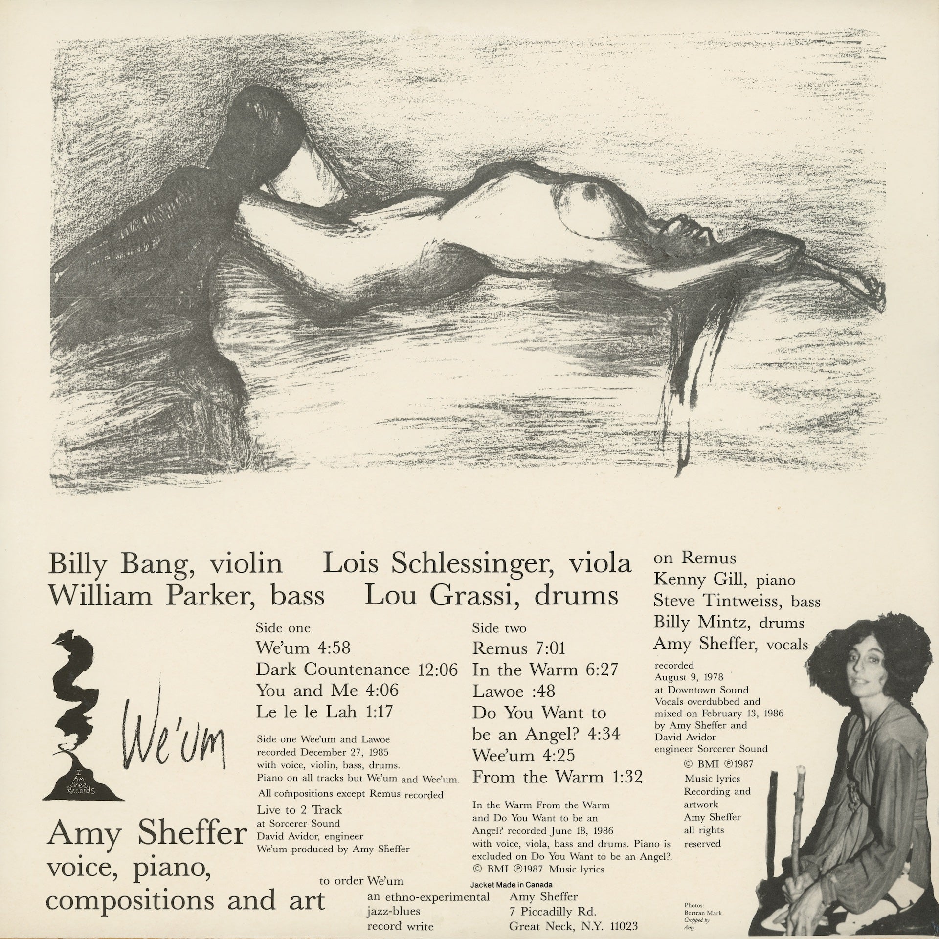 The hallucinatory, exploratory environments of these live experiences are documented in the selections of I Am Shee. “Yellow Wings” and “Quiet Land”, taken from Sheffer’s debut album Sanctuary Mine (1980), feature her haunting lyrics over cloudy compositions, shimmering and shaking with Tintweiss, Fields, Kenny Gill, and Billy Mintz’s improvisation. “Amerasia” and the title track from her second album, Where’s Your Home (1985), represent a search for new forms, with musicians like Durrah and Johnson on piano, Parker on bass, John Disselt on reeds and electric piano, and Chakaq Johnson on drums. Later, Sheffer recorded “From the Warm”, “Into the Warm” and “We’Um” — each layering textures and moods into atmospheres and spells. These tracks from We’um (1987) were centered around the string trio of Parker, Lois Schlesinger, and Billy Bang, and the percussion of Mintz and Lou Grassi.