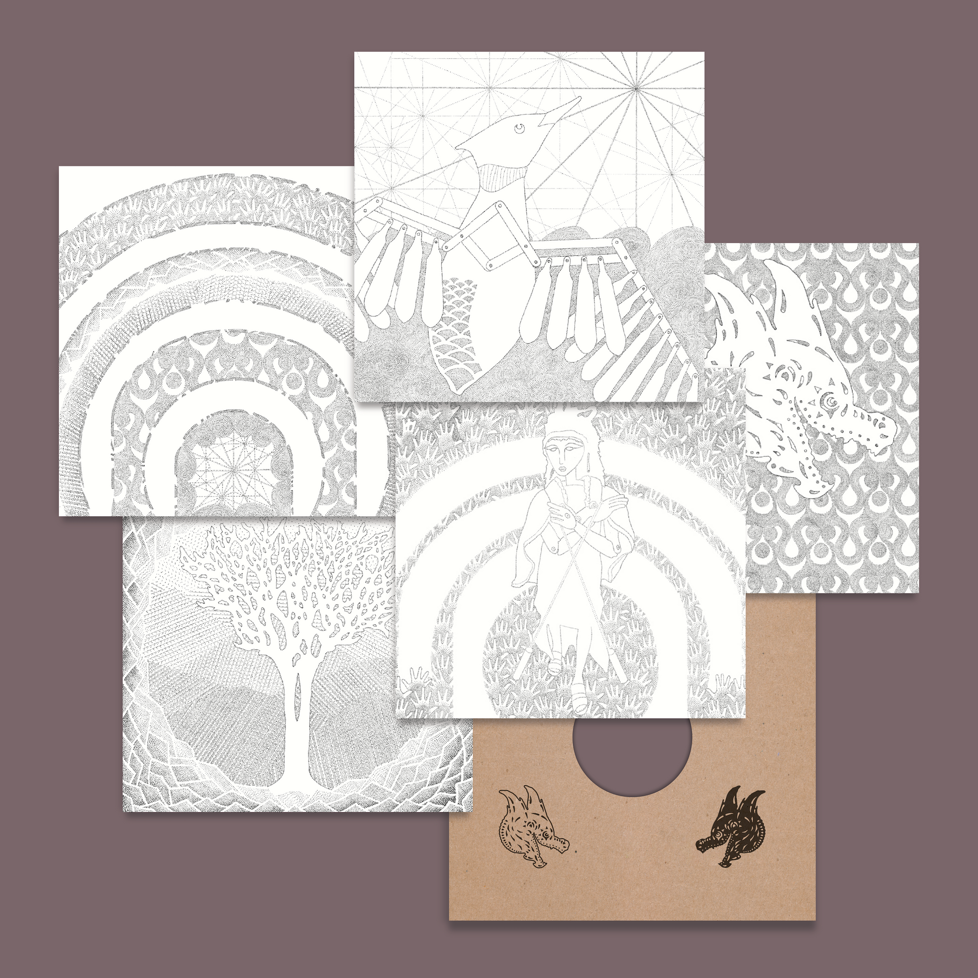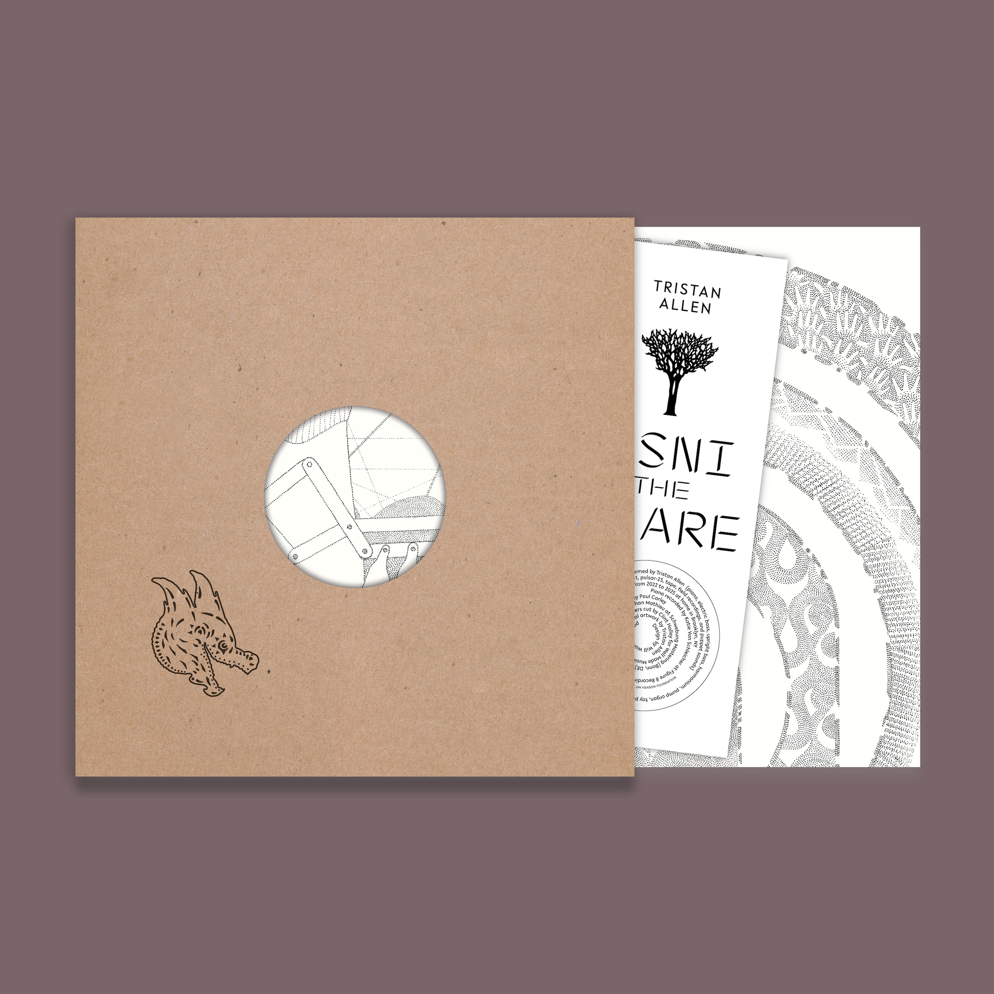 Hour-long improvisations fed through Bastl Thyme and NanoVerb created long decaying delays, with the best moments culled for songs. Fire sounds emerged from fingernail clicks on piano keys. Field recordings captured dismantling a piano base, extinguishing candles, and sounds from a hospice. The Dragon's voice speaks words from Allen's invented language. Melody often sits in the bass—inspired by both goth and gamelan—with ornamentation working upward. The detailed approach mirrors a stippling, not dissimilar to Allen’s original artwork for the album cover, accumulating small bits into a vast picture through their obsessive work—in the shower, before falling asleep, mid-sentence.